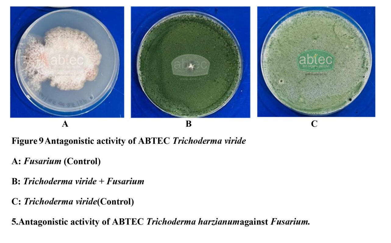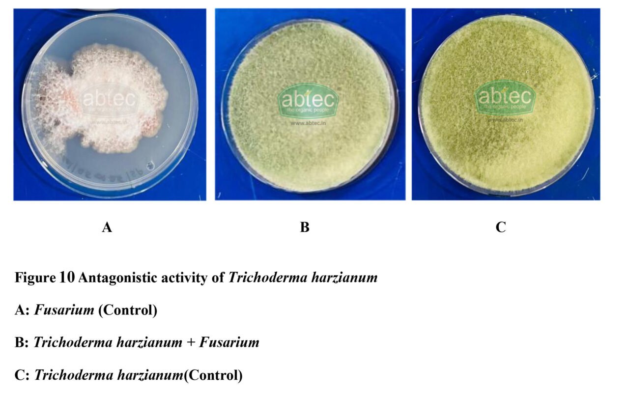 ABTEC Trichoderma harzianum also exhibited a strong antagonistic activity against Fusarium. T. harzianum significantly restricted the radial growth of the Fusarium. The dominance of T.harzianum growth suggests suppression is mainly through competitive exclusion and mycoparasitism (Figure 10).