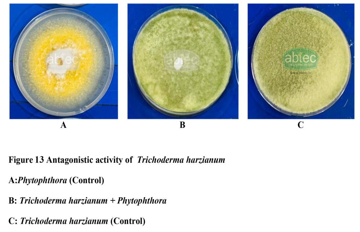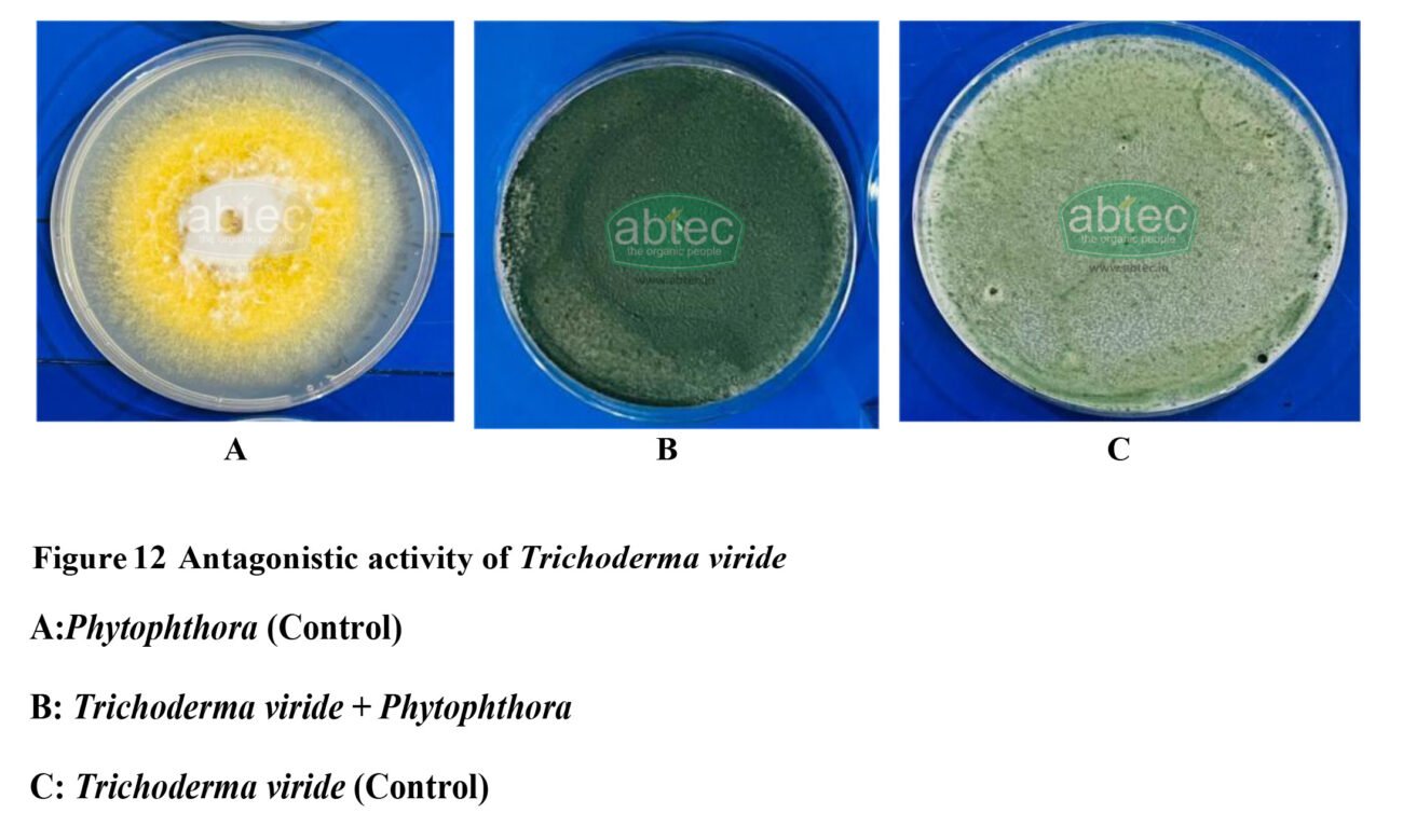 ABTEC Trichoderma viride exhibited strong antagonistic activity against Phytophthora. T. viride rapidly colonized and overgrew the pathogen. No distinct inhibition zone was observed, indicating suppressionis primarily through competitive exclusion and mycoparasitic interaction, rather than antibiosis alone. (Figure 12)