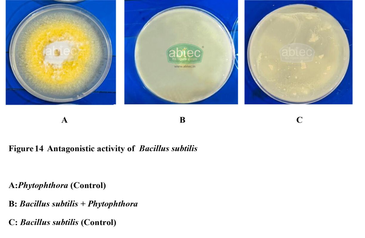 ABTEC Bacillus subtilis exhibited significant antagonistic activity against Phytophthora. The radial growth of the pathogen was markedly restricted.